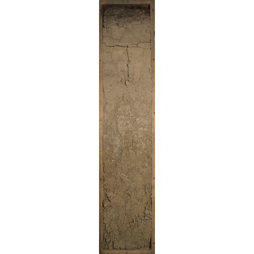 появляются темно-серые пятна. Цвет между 2.5Y7/3 и 2.5Y6/3. Сцементированный. Плотный,