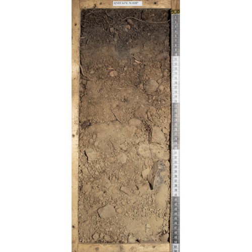 BC (24-50 см) – серовато-палевый. Цвет между 10YR7/3 и 10YR7/4. От уплотненного до слегка уплотненного. Легкий суглинок (более тяжелый, чем вышележащий). Включения – крупные валуны, мелкие корешки трав. Почвенная масса в правом нижнем углу имеет меньше серых тонов. Верхняя половина горизонта сильнее окрашена бурыми тонами.