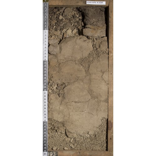 Включения – остатки растительности. Граница волнистая, переход заметный. CRM1 (7-37(43) см) – коричневый с