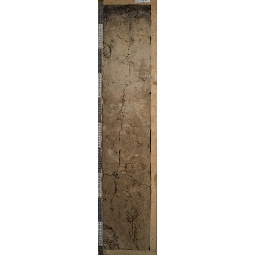 BEL (20(27)-49 см) – неоднородно окрашен: в верхней части (особенно слева) преобладают белесые тона, а в нижней – красно-бурые с ржавыми пятнами (7.5YR5/4 + 7.5YR6/4). Очень плотный, сцементированный, бесструктурный. Одна горизонтальная трещина на глубине 31 см, из центра которой отходит мощная глубокая вертикальная трещина (доходящая до 77 см). Легкий-средний суглинок. Граница слабоволнистая (по тонкой горизонтальной трещине), переход постепенный.