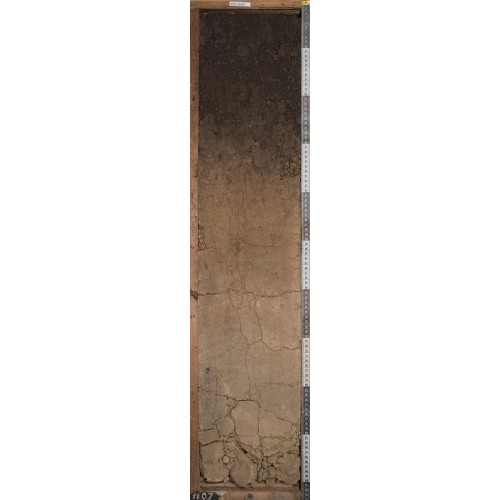 светлее обоих вышележащих горизонтов. Цвет между 10YR2/2 и 10YR2/1. Плотный, весь в мелких трещинах, которые