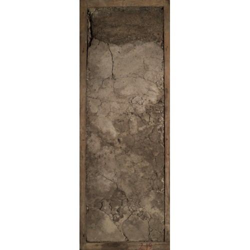 окрашен: буровато-серые пятна (2.5Y4/2) чередуются с серовато-белесыми (цвет между 2.5Y7/3 и 2.5Y6/3). Темная окраска – скорее всего затеки.