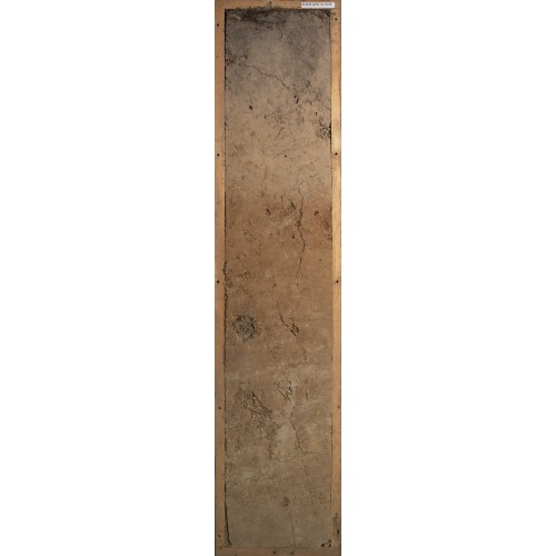 C (66 – 100 см) – неоднородно окрашен: серовато-буровато-палевый, цвет 7.5YR6/4. С глубиной начинают преобладать палевые тона. Есть крупные пятна неправильной формы белесого цвета. Очень плотный. Сцементированный. Бесструктурный. Местами по трещинам встречаются ореховато-призматические структуры и структуры неправильной формы. Опесчаненный средний суглинок. Включения остатков корней. Тонкая вертикальная трещина