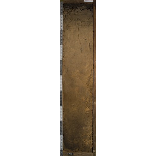 Буровато-серый с охристыми пятнами справа, на границе с нижележащим горизонтом (110YR5/6).