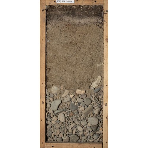 переход заметный, граница волнистая. C (10(11)-25(30) см) Сероватый песок с охристо-палевым оттенком (5/3 2,5Y), песок, бесструктурный, местами общий фон имеет более ярко выраженные желтоватые тона, пронизан корневыми системами на всю мощность. Содержит минеральные зерна, свободные от красящих железистых пленок. Включает окатанные фрагменты пород, как мелкие до 0,5 см, так и более крупные гальки d до 1,5 см. Переход заметный по смене породы. R (25(30)-48 см) Галечник, размер окатанных обломков до 5 см, поверхности покрыты тонкими пылеватыми «рубашками». |