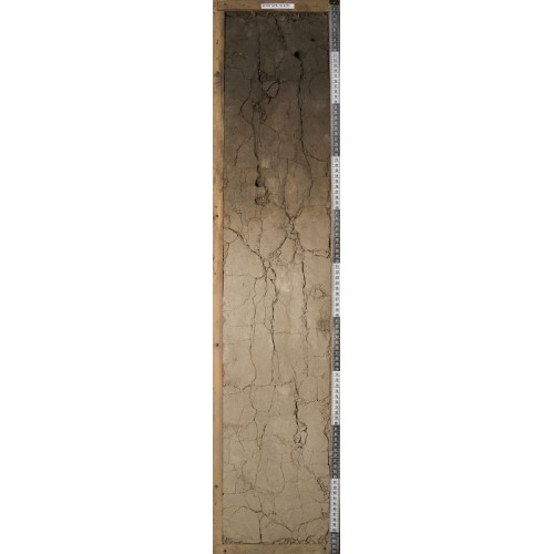 см) Палево-светло-серый, однородный, цвет по Манселлу (6/3 10YR), структура выражена слабо, рассечен сетью трещин на призмовидные
