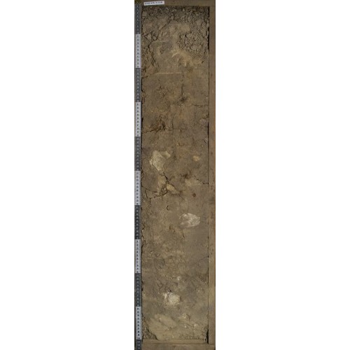 С (50(55)-100 см) Неоднородно окрашен: на сероватом фоне заметны зоны палевого материала (светлее вмещающей толщи)(от 6/4 до 5/2 2.5Y), практически бесструктурный, монолитный, содержит обломки кристаллических пород и карбонатов до 6 см в d.