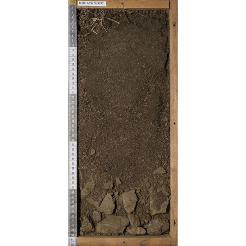 Описание почвенного монолита | АY (0-18(22) см) – буровато-серый, цвет между 10YR4/2 и 3/2. Примесь мелких камушков до 0,5 см. сверху