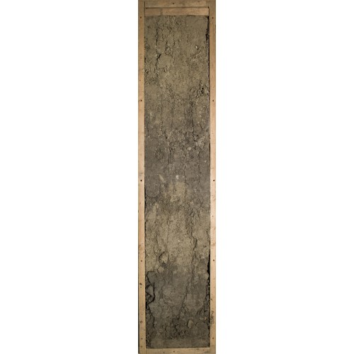 AU (0 — 23 см) — буровато-серый, 2.5Y4/2. Средний суглинок. Плотный, несколько мощных вертикальных трещин, горизонтальных — нет. Практически вся масса горизонта сцементирована, но есть отдельные вертикально развитые структуры (призмовидные 1,5 — 3 см). Включения — единичные очень мелкие корни. Граница волнистая, переход заметный.
