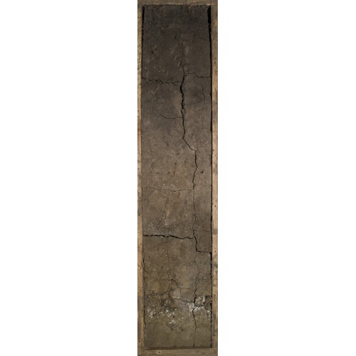 Описание почвенного монолита | AU (0 – 34(45) см) – буровато-темно-серый. Цвет 2.5Y3/2. Весь горизонт плотный, сцементированный. С 11 см начинается крупная вертикальная трещина, идущая до самого низа ПМ. От нее отходят достаточно крупные горизонтальные трещины. Система трещин напоминает по форме корневую систему. Структура в верхней части горизонта (левый угол) плоские (как потрескавшаяся пленка) ореховато-мелко-призматическая структурки, их толщина не более 1,5 мм. В противоположном углу – видны мелко-комоватые структуры. Средний суглинок. Новообразования – карбонатные пятнышки. Включения корней. Переход постепенный, граница затечная. Qml (34(45) – 93 см) – неоднородно окрашен: коричневато-бурый фон с серыми, белесыми и белыми пятнами. Цвет 2.5Y5/3. Книзу «грязь» в цветах увеличивается. Очень плотный, растрескавшийся. Сцементированный, но есть отдельные призматические структурки. Новообразования: в верхних 2/3 горизонта карбонатные пятнышки, а на границе с CQ – крупные пятна и затеки по трещинам. Тяжелый суглинок – легкая глина. Граница волнистая, переход слабо заметный за счет скопления карбонатов. CQ (93 – 100 см) – серовато-бурый с оливковым оттенком. Цвет 2.5Y5/4. Полностью сцементирован, очень плотный, Бесструктурный. Супесь, либо опесчаненный суглинок. Новообразование – единичное карбонатное пятнышко. |